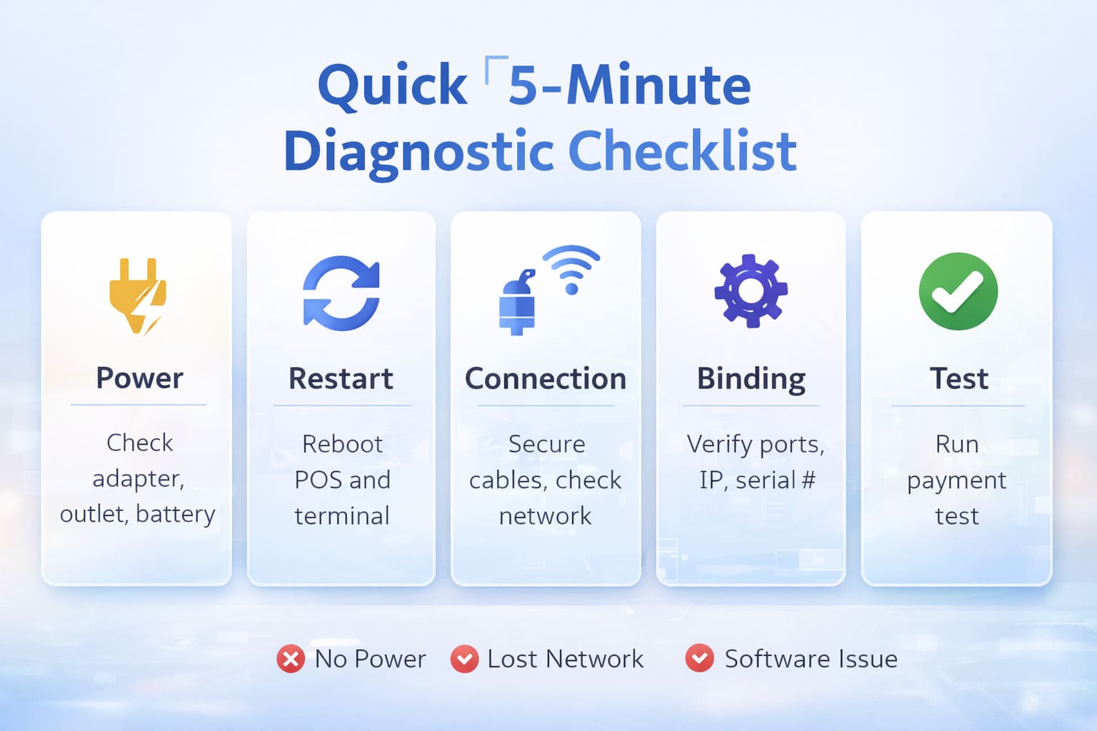 • 1) Power & Physical Check (1 min) — Terminal powered on? (Check LED lights, screen status.) Power adapter plugged into a working outlet? Battery-powered devices: Charge for 5 minutes, then restart. Ethernet: Check cable and port lights on the switch/router.