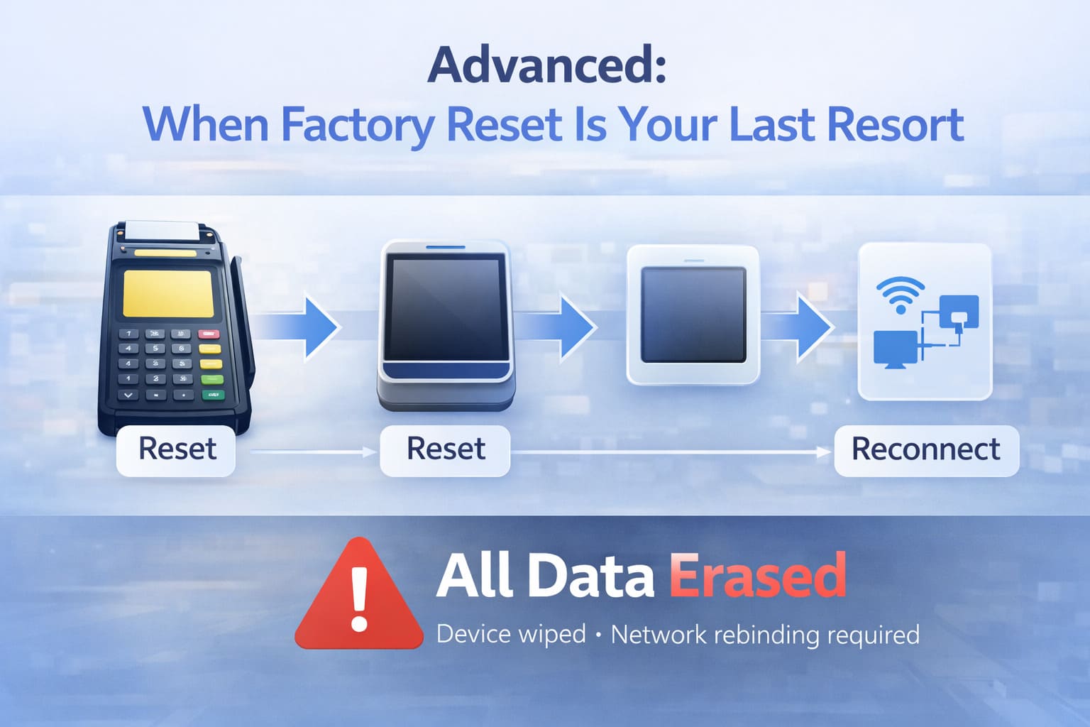 • How to Reset (varies by brand): Verifone: Service Menu > System > Reset/Format > Confirm (asks for password; default varies). Ingenico: Service Menu > System > Erase Device/Factory Reset (similar warning screen). PAX: Settings > Reset > Factory Reset (usually requires PIN).