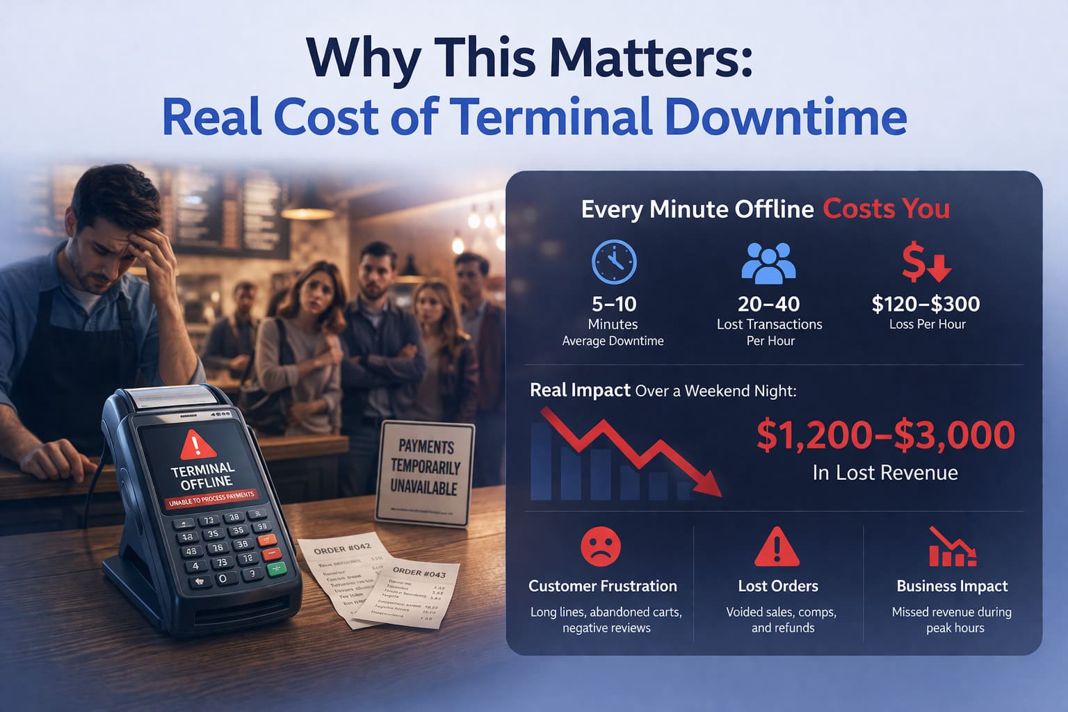 Critical: A 2-hour terminal outage in a busy restaurant can mean $1,200–$3,000 in lost revenue. Most outages solve in 5–15 minutes if you know the diagnostic sequence.
